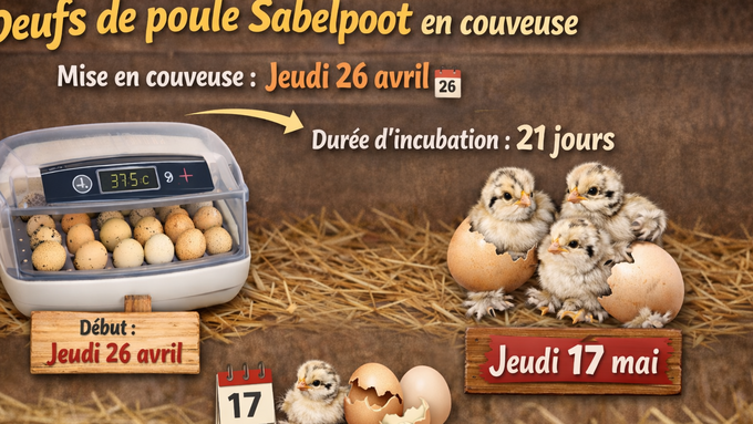 Par JESSICA VANGHENT, publié le samedi 4 avril 2026 13:25 - Mis à jour le samedi 4 avril 2026 13:25Nous avons mis en couveuse des œufs de poule naine de race Sabelpoot 🐣 L’incubation est lancée pour environ 21 jours, avec l’espoir de voir bientôt naître de petits poussins. -
